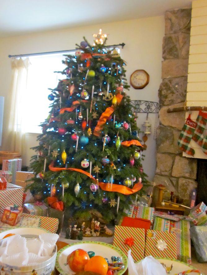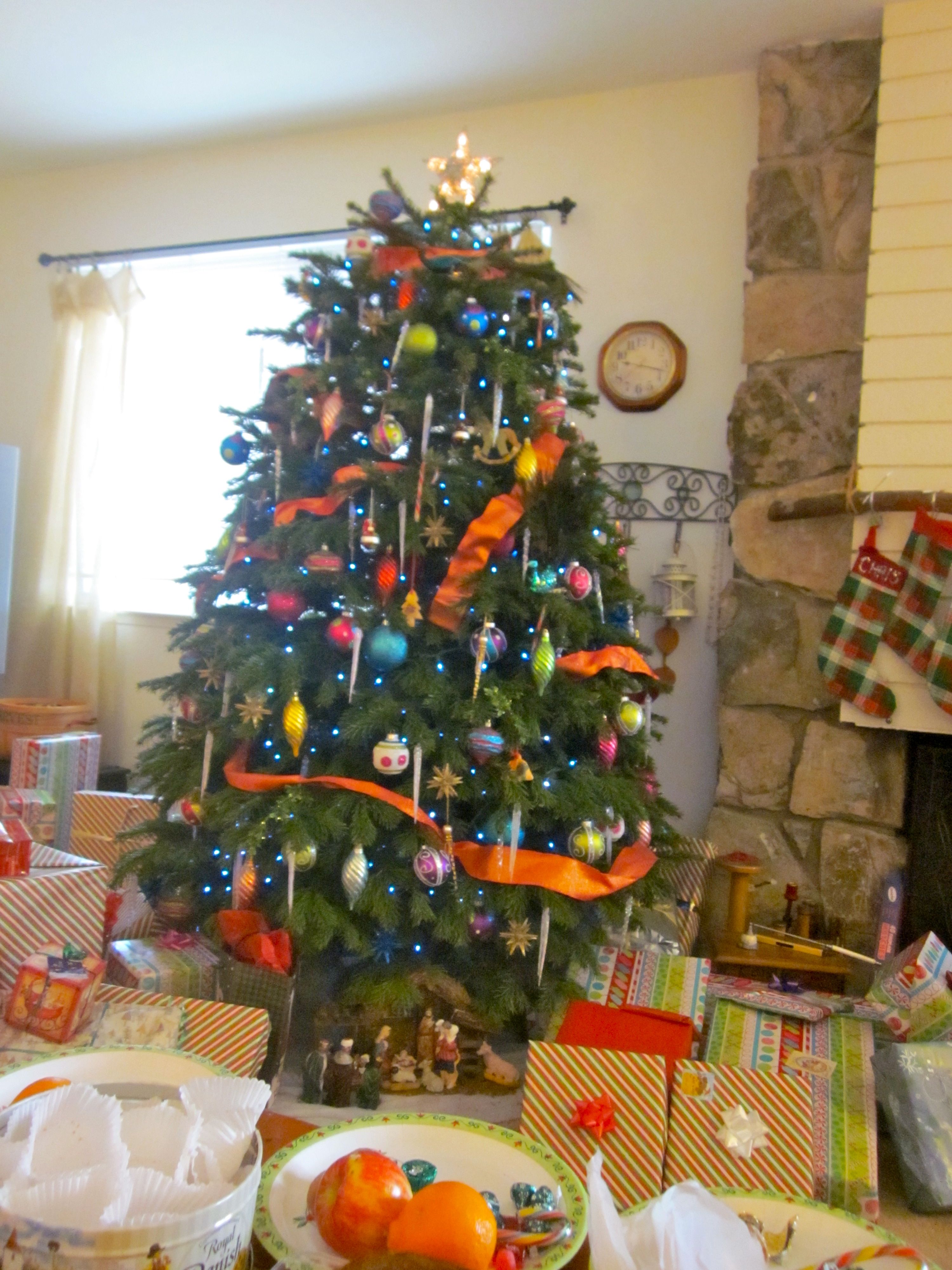 Grandma’s tree. They went with blue lights this year.