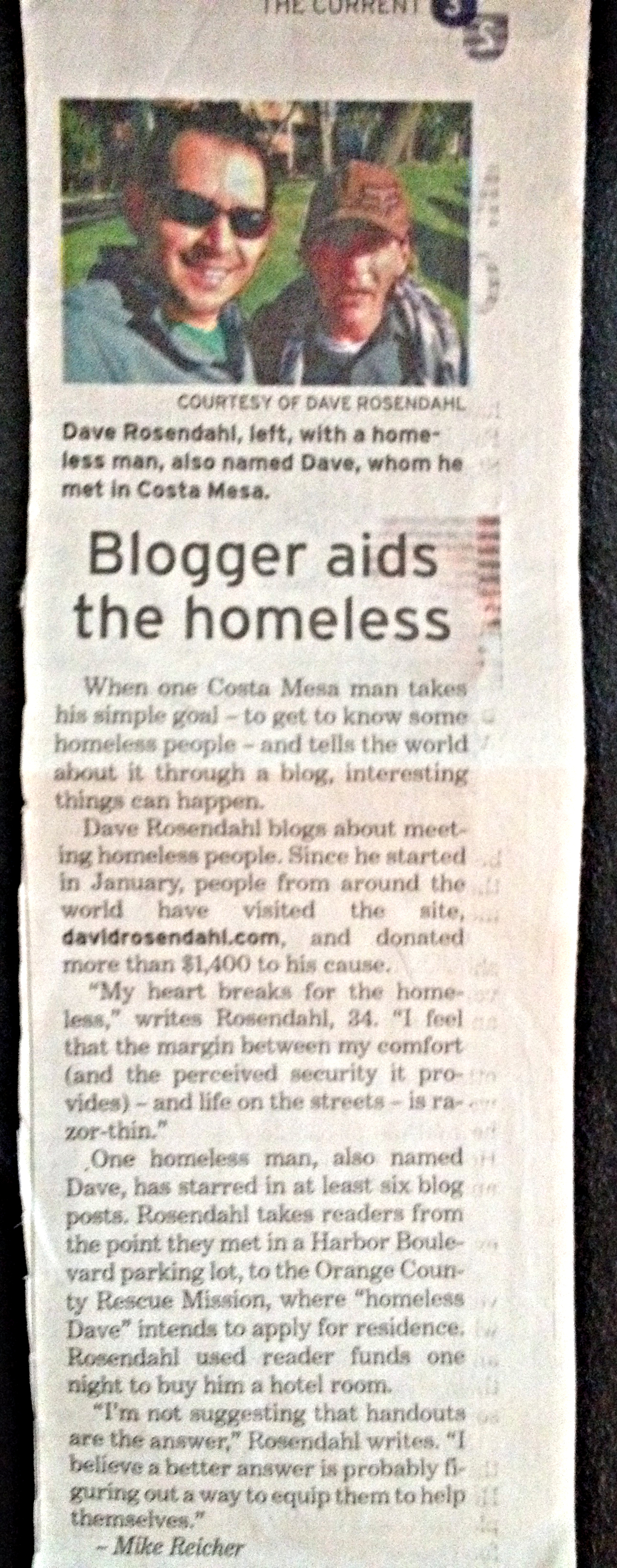 Many of you remember Dave, a homeless friend I met last year in front of Target in Costa Mesa (my hometown).  You can read stories about our time together here.  Last year, our story was picked up by a local paper (as you can see in the snapshot to the right) and repeated here to make it easier to read: